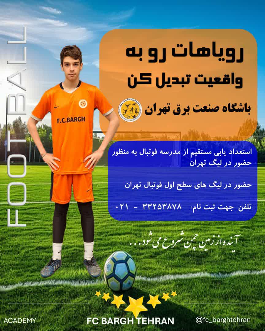 🔹با حضور مربیان باشگاههای مطرح لیگ برتری (استقلال و پرسپولیس و سایپا) 🔹استعداد یابی مستقیم از مدرسه فوتبال به منظور حضور در لیگ تهران (مدرسه فوتبال چهار فصل) 🔹تمرینات در زمین طبیعی و مصنوعی مسقف مناسب فصل سرما و بارش⛈ برگزار می شود . ♦️جایگاه ویژه اسکان والدین محترم بازیکنان مجهز به وسایل گرمایشی و رفاهی در فصل سرما 💥تخفیف ویژه شهریه فصل زمستان 🔻تلفن دفتر فوتبال : ☎️